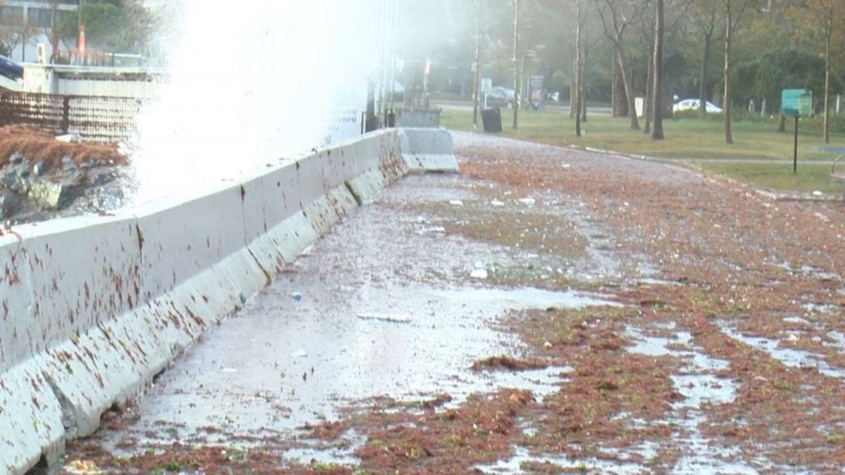 DHA'nın haberine göre; öte yandan, dalgalarla birlikte kıyıya kırmızı yosunlar vurdu.