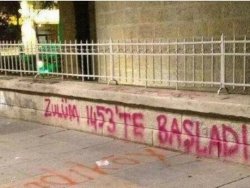 Eylem yaptıkları yerlerdeki duvarları sloganlarla dolduran Geziciler'in Kadıköy'deki bir duvara yazdıkları bir cümle epey tepki çekeceği benziyor. İstanbul'un Fatih Sultan Mehmet tarafından 1453'te fethedilmesine gönderme yapan duvar yazısında, 'Zulüm 1453'te başladı' ifadeleri kullanıldı. Yazılamanın yapıldığı yer Atina değil Kadıköy'dü.