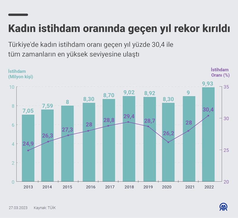 Türkiye'de istihdam edilen kadın sayısı 2005'te 4 milyon 773 bin seviyesinde iken 2015'te 8 milyona, 2019'da 8 milyon 925 bine çıktı. 2020'de 8 milyon 299 bine gerileyen bu sayı, takip eden yıllarda hızla artarak 2021'de 9 milyona, 2022'de ise 9 milyon 935 bine ulaştı. Böylece, ülkede istihdam edilen kadın sayısı 2005-2022 döneminde 2 katına çıkmış oldu.