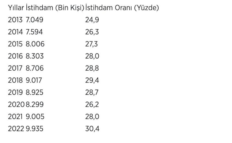 2022'de yüzde 30,4'e çıkan kadın istihdam oranı, tüm zamanların en yüksek seviyesine ulaşmış oldu.