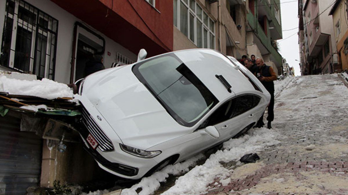 Kağıthane'de buzlu yolda kayan araç doğalgaz kutusuna çarptı VİDEO