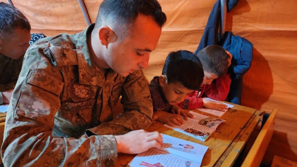 Deprem bölgesinde görev yapan Mehmetçikler, "Bir Kitap Bir Çocuk, Bir Çocuk Bir Umut" diyerek Mehmetçik Okulunda eğitim gören evlatlarımıza kitap dağıtarak onlarla okuma saati de gerçekleştiriyor.