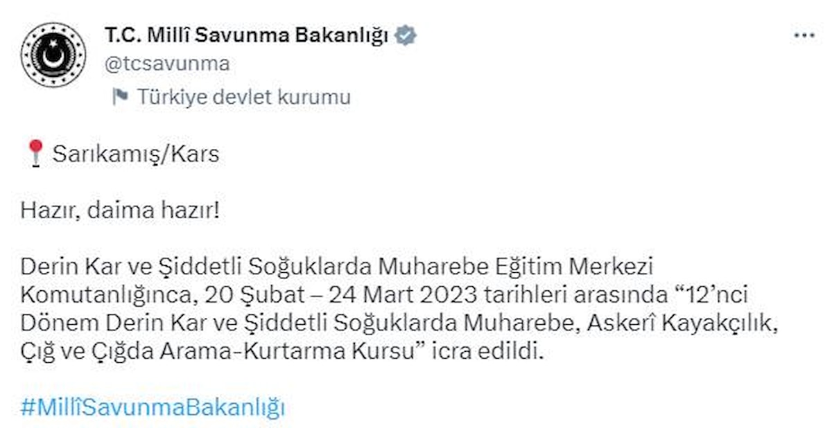 Hazır, daima hazır. Derin Kar ve Şiddetli Soğuklarda Muharebe Eğitim Merkezi Komutanlığınca 20 Şubat-24 Mart 2023 tarihleri arasında ‘12’nci Dönem Derin Kar ve Şiddetli Soğuklarda Muharebe, Askeri Kayakçılık, Çığ ve Çığda Arama-Kurtarma Kursu’ icra edildi.