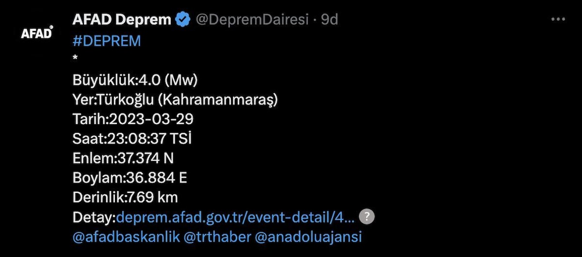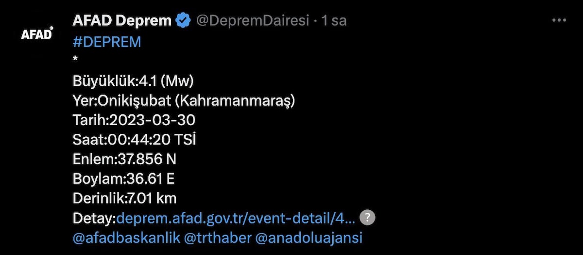 6 Şubat'tan bu yana artçıların sürdüğü kentin Türkoğlu ilçesinde saat 23.08'de 4 büyüklüğünde, Onikişubat ilçesinde saat 00.44'te 4.1 büyüklüğünde sarsıntılar yaşandı.