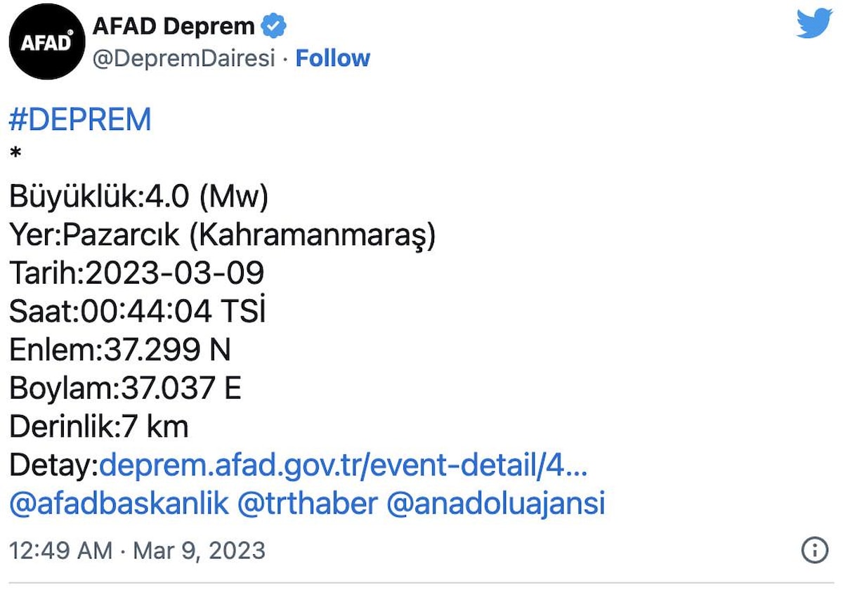 Afet ve Acil Durum Yönetimi Başkanlığı depremin 7 kilometre derinlikte olduğunu açıkladı.