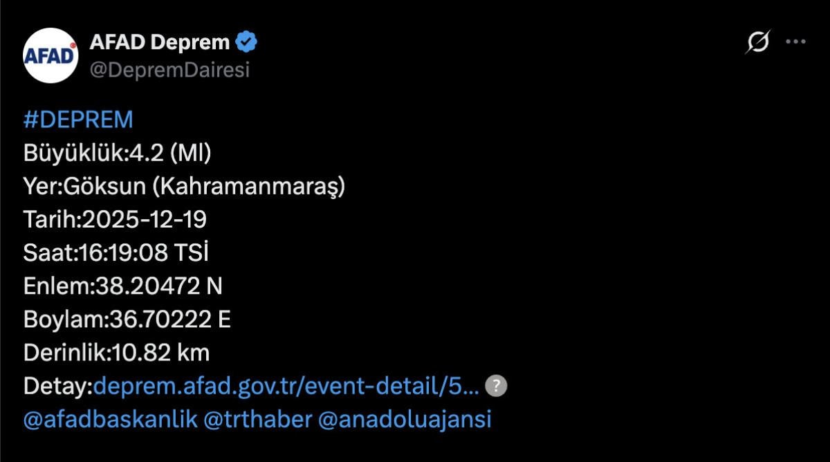 Afet ve Acil Durum Yönetimi Başkanlığı'nın (AFAD) paylaştığı son verilere göre, Kahramanmaraş Göksu merkezli 4.2 büyüklüğünde bir deprem oldu.