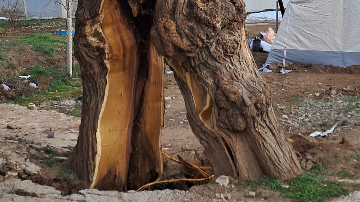Ağacın gövdesinde oluşan bölünme, sarsıntının şiddetini gözler önüne serdi.