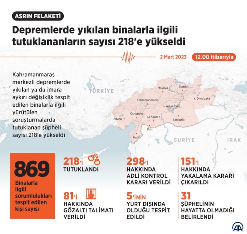 Binalarla ilgili sorumlulukları tespit edilen kişi sayısı ise 869'a ulaştı. 81'i hakkında gözaltı talimatı verilirken, 298'i hakkında ise adli kontrol kararı verildi.