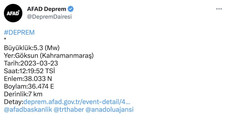 AFAD, saat 12.19'da merkez üssü Kahramanmaraş'ın Göksun ilçesi olan 5.3 büyüklüğünde deprem meydana geldiğini bildirdi.