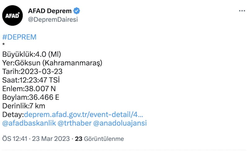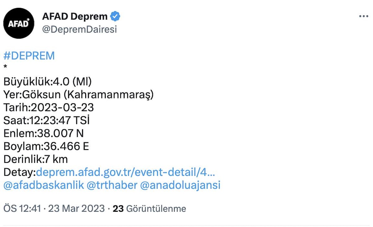 Kahramanmaraş ilimizin Göksun ilçesinde meydana gelen 5.3 büyüklüğündeki artçı #deprem sonrasında, an itibarıyla, olumsuz bir durum bulunmamaktadır.