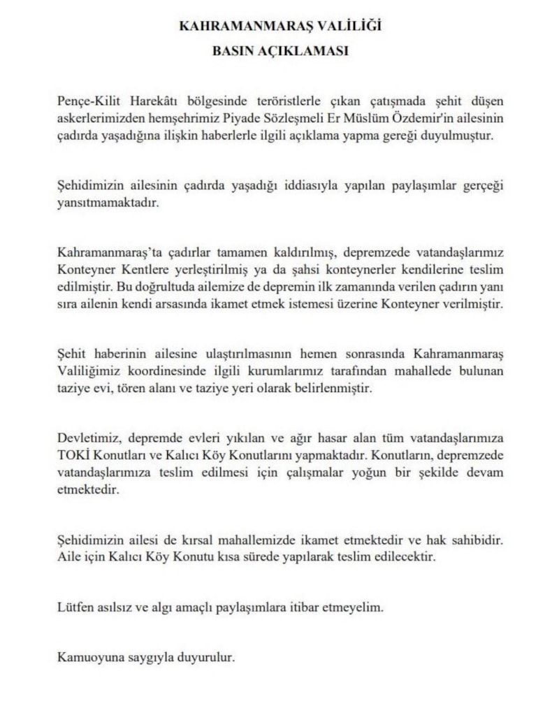 Kahramanmaraş Valiliği, teröristlerle çıkan çatışmada şehit düşen Piyade Sözleşmeli Er Müslüm Özdemir'in ailesiyle ilgili çıkan haberlerin gerçeği yansıtmadığını ifade ederek basın açıklaması paylaştı.