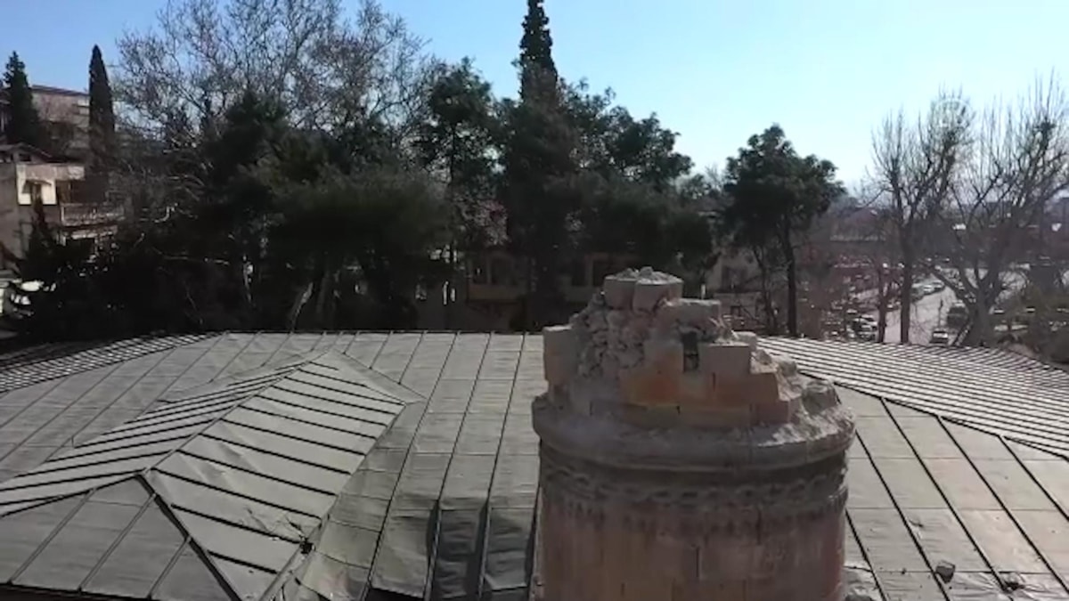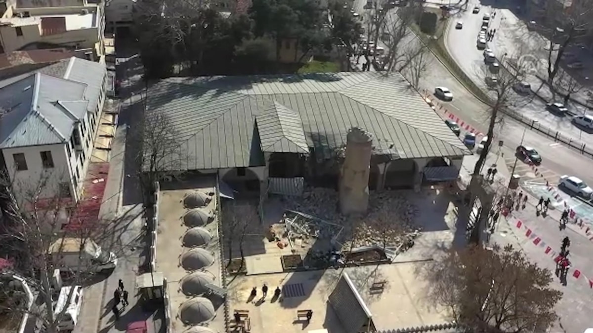 Atatürk Meydanı'na yakın tarihi Ulu Cami'nin de minaresi şiddetli sarsıntıda devrildi.