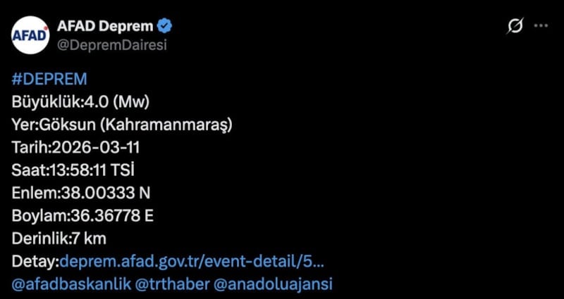AFAD'dan yapılan açıklamaya göre Kahramanmaraş'ın Göksun ilçesinde 4.0 büyüklüğünde deprem meydana geldi.
