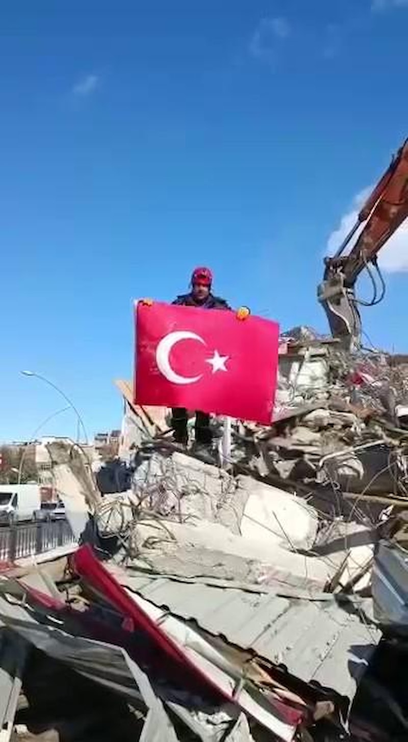 Afşin ilçesinde enkaz kaldırma çalışmalarına katılan Çorum AFAD ekibi çalışanının, bayrağı kaldırmak için çalışmaları durdurması takdir topladı.