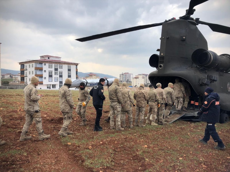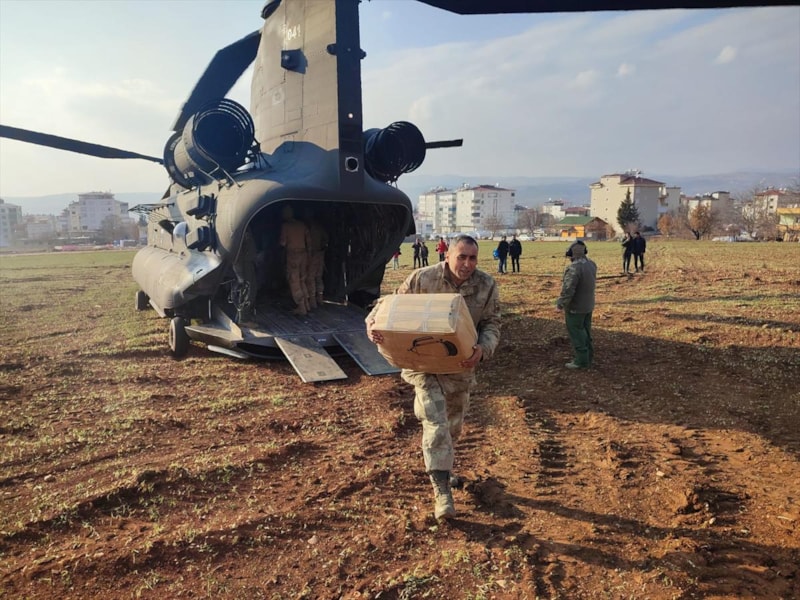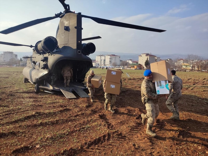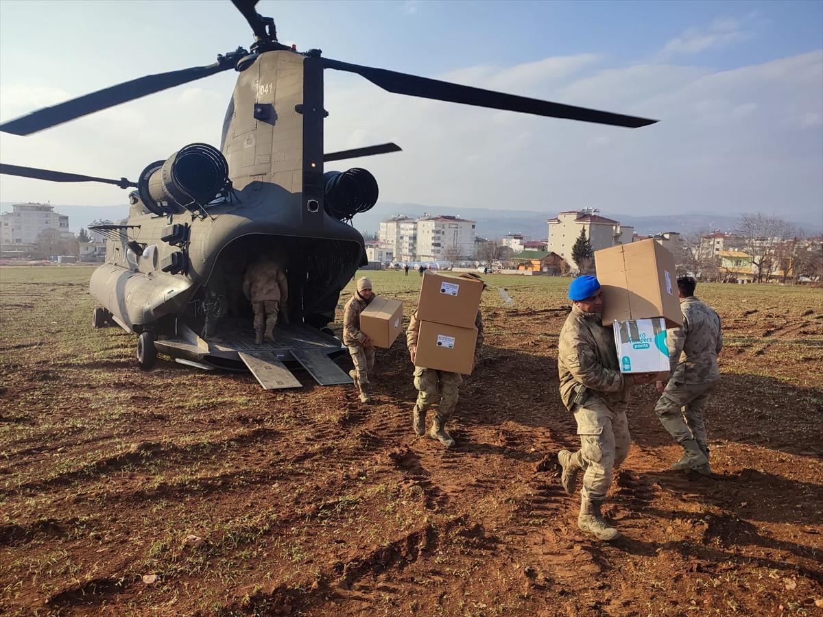 Kahramanmaraş merkezli depremlerin ardından yurt içi ve dışından gönderilen yardımlar, Adana'daki İncirlik Hava Üssü'nden havalanan helikopterlerle Pazarcık ilçesindeki kırsal mahallelerdeki afetzedelere ulaştırılıyor.