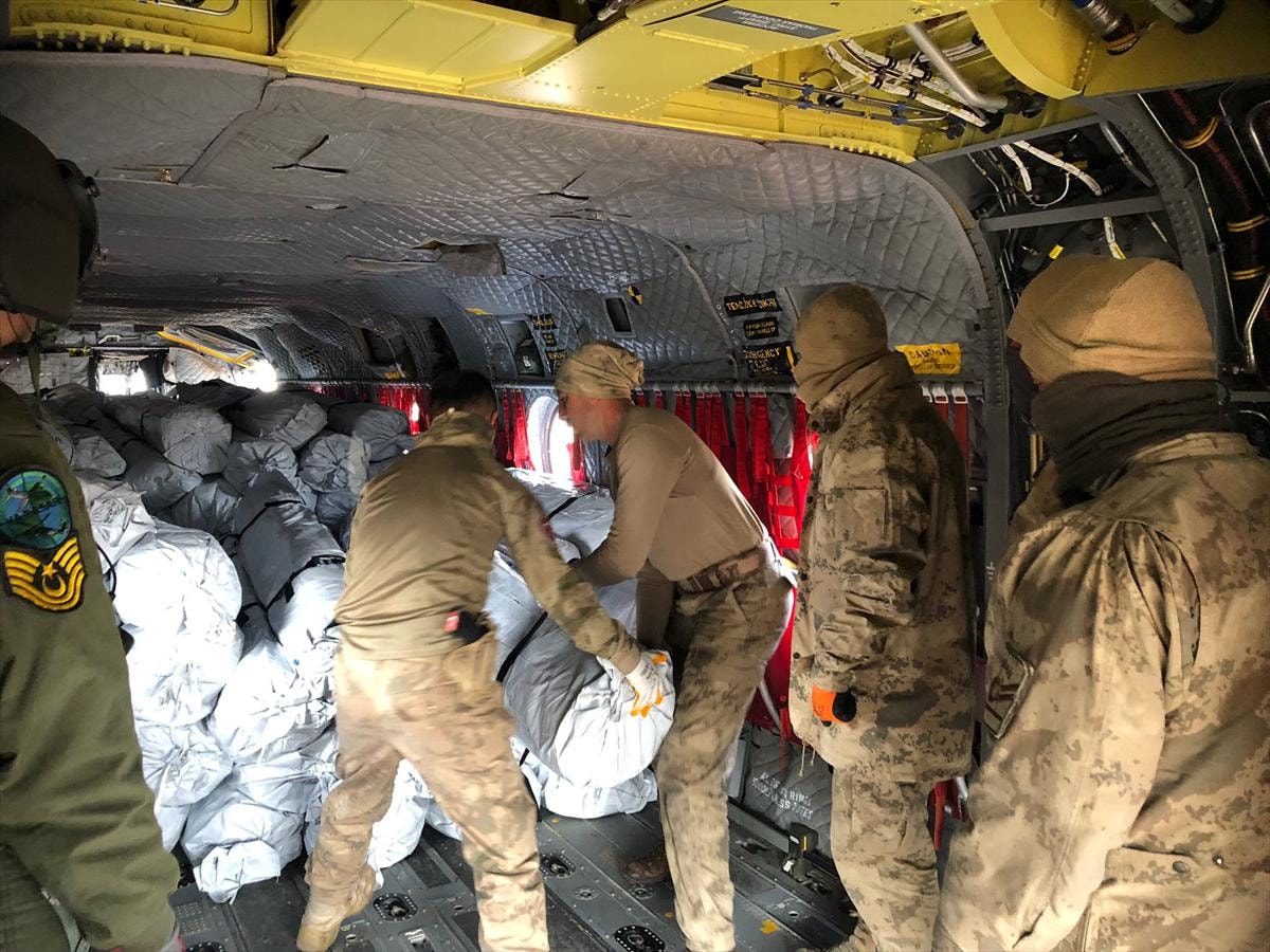 Bölgedeki Sinop İl Jandarma Komutanlığı ekipleri de helikopterlerle getirilen yaşam malzemelerinin depremzedelere ulaştırılmasında görev alıyor.