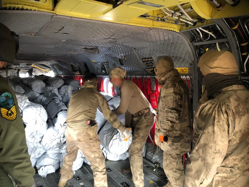 Depremin ardından İncirlik Üssü'ne getirilen yardım malzemeleri, kırsal ve dağlık mahallelere helikopterlerle taşınmaya devam ediliyor.