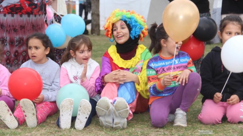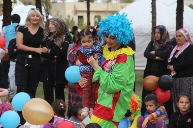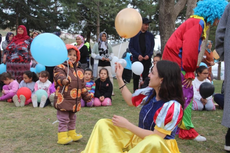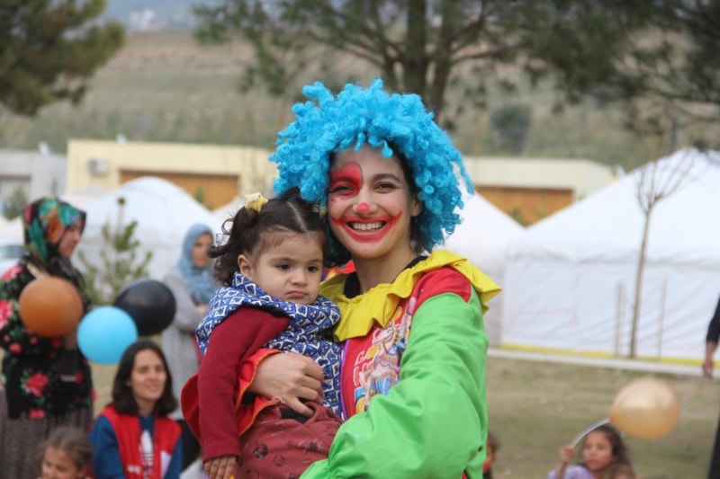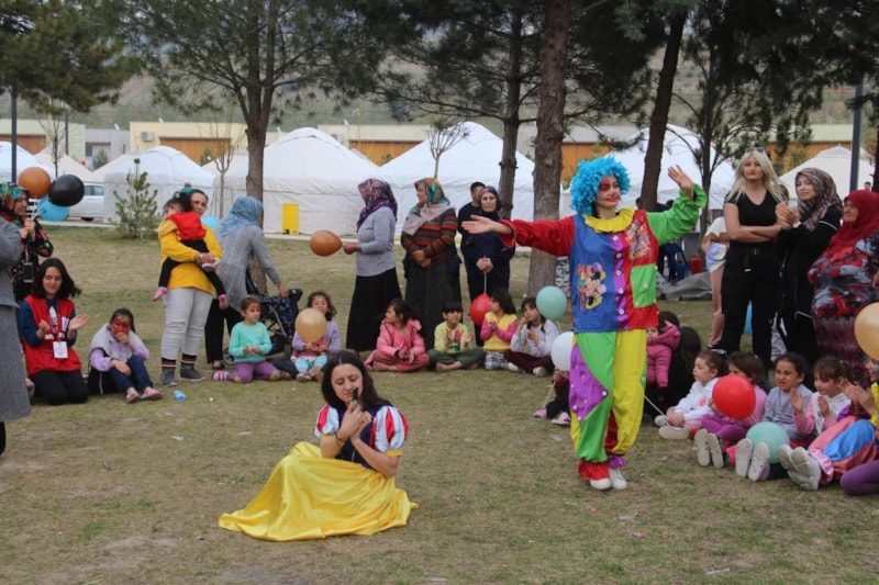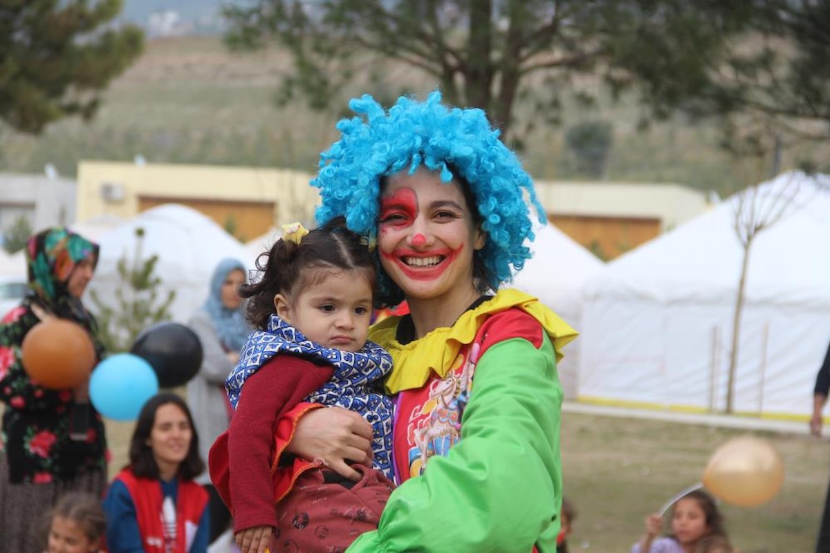 Orada bulunan depremzede çocuklarla gün boyu şarkılar söyleyip oyunlar oynayan palyaçolar, oyuncak dağıttı. Çocuklarının yüzlerinin güldüğünü gören anne ve babaların yüzleri de tebessüm etti.