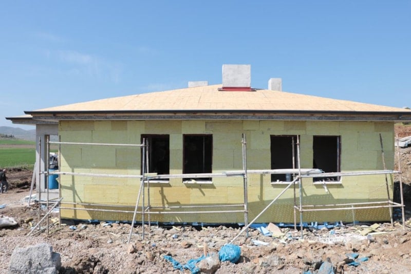 Burada 40 tane hak sahibimizin konutunu yapıyoruz ve bayramın birinci gibi teslim etmeye başlayacağız. Her gün sayıyı çoğaltarak 1 yıl içinde konutlarımızı tamamlayacağız. Bu köy haricinde 7 köyümüzde projemiz var. Şu anda 400 personel ile çalışıyoruz. 25 adet iş makinemiz var ve bu rakamlar artıyor. Buradaki yapılan konutlar yöresel mimariye ve kültürel yapıya uygun şekilde malzeme tespiti yapılıyor. Evler yapılırken köy halkının faydalanacağı şekilde mutfak, yatak odası ve salonları da dizayn ediliyor.