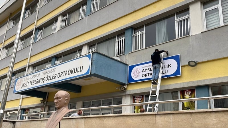 Onikişubat ilçesinde 8 öğrenci ile 1 öğretmenin yaşamını yitirdiği silahlı saldırının yaşandığı Ayser Çalık Ortaokulu'nun tabelası yeni taşınacağı binaya asıldı.
