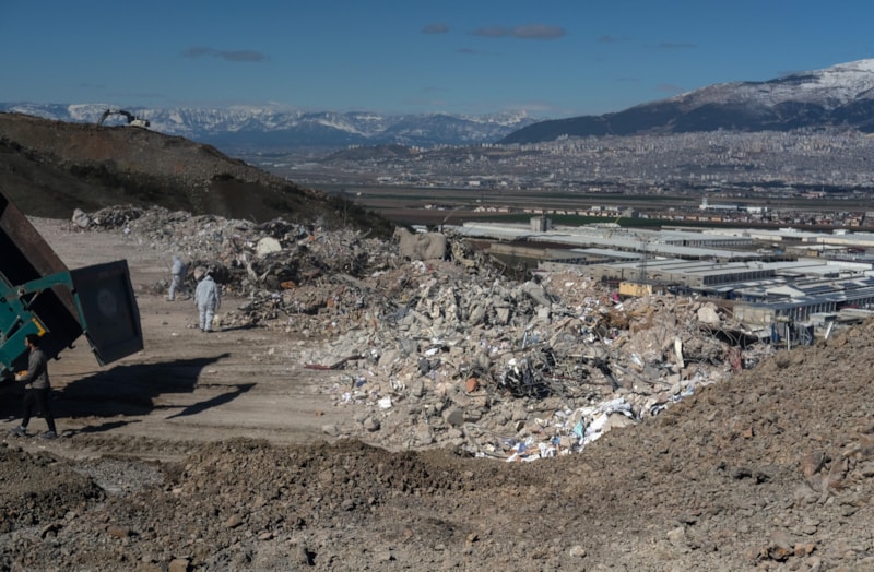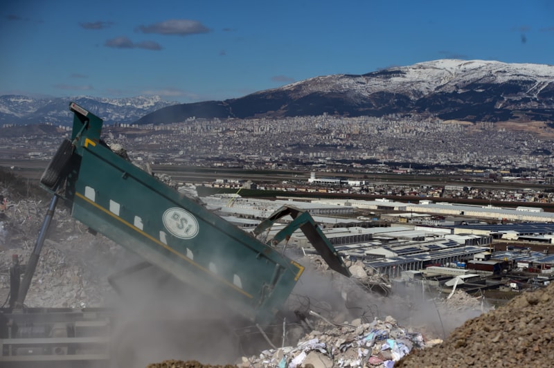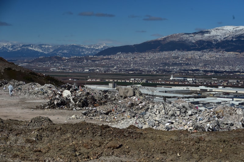 Asrın felaketinin ardından enkazların oluşturduğu dağ boyutundaki görüntü yıkılan şehrin manzarasıyla birleşirken kamyonlar ile şehrin başka bir tarafına taşınması görüntülere yansıdı.
