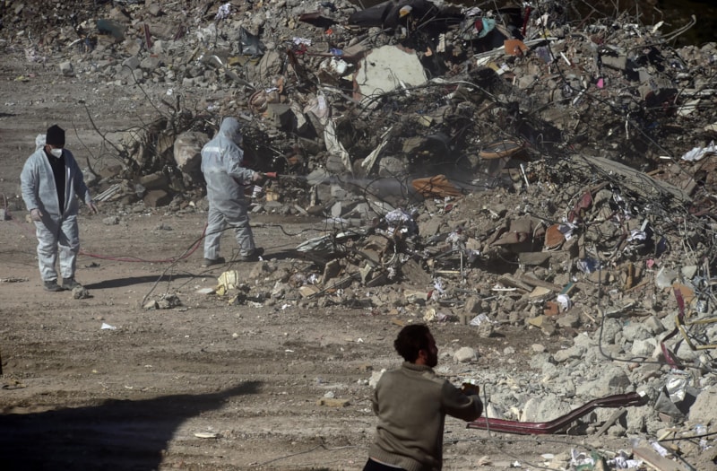 Binanın taşınan enkazı ekipler tarafından dezenfekte edildikten sonra üzerinden dozerle geçiliyor.