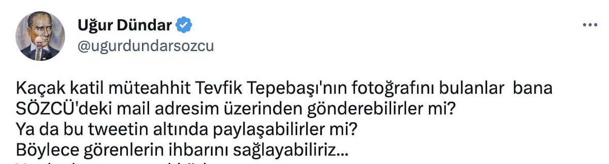 Kaçak katil müteahhit Tevfik Tepebaşı’nın fotoğrafını bulanlar bana Sözcü’deki mail adresim üzerinden gönderebilirler mi? Ya da bu tweetin altında paylaşabilirler mi?