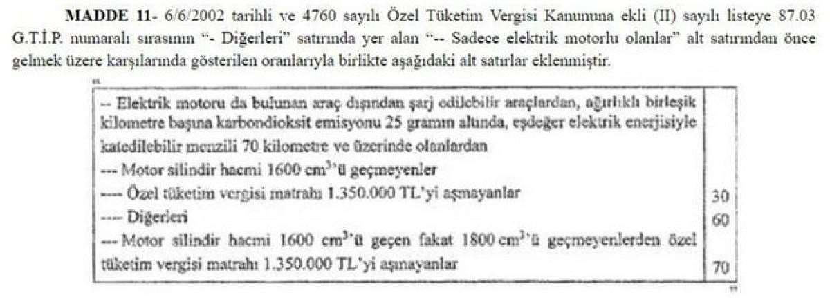 Hibrit araçlara da ÖTV teşviği resmileşmiş oldu. Bu kapsmada araç dışından şarj edilebilen 70 kilometrenin üzerinde menzile sahip hibrit araçlara Özel Tüketim Vergisi teşviği sağlanacak.
