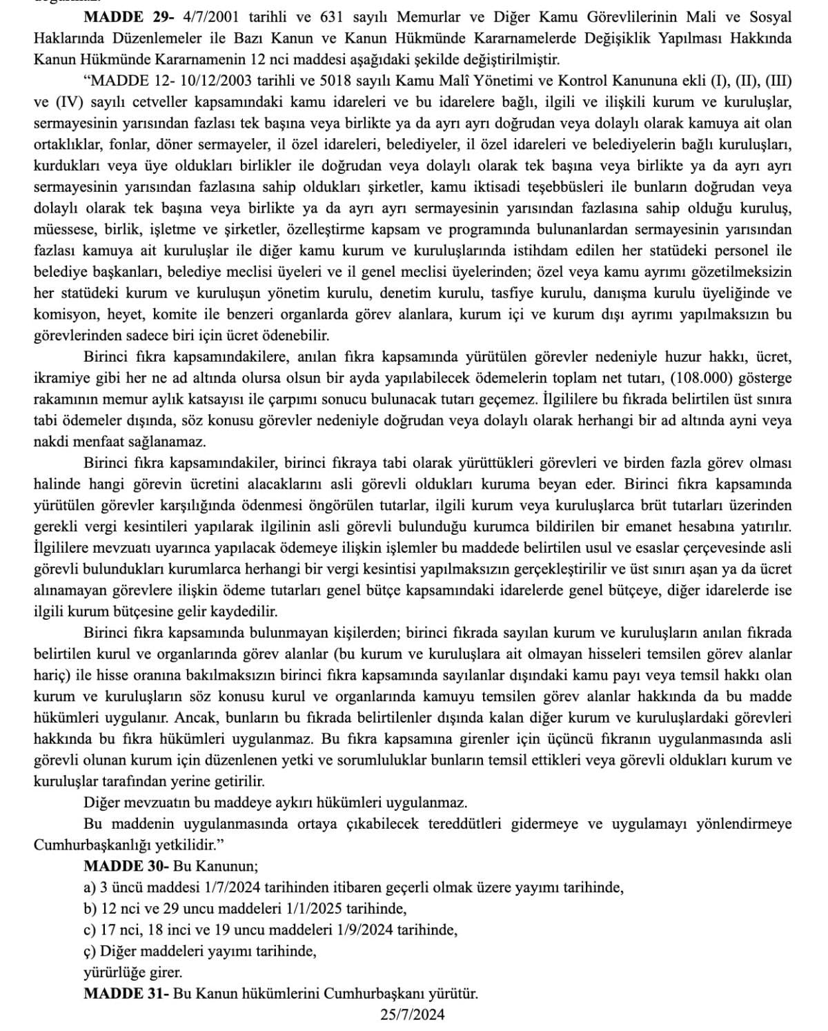 Düzenlemeyle, her statüdeki kamu görevlileri sadece bir görevi için maaş alacak. O maaş en yüksek devlet memuru maaşını yani 98 bin lirayı geçemeyecek.