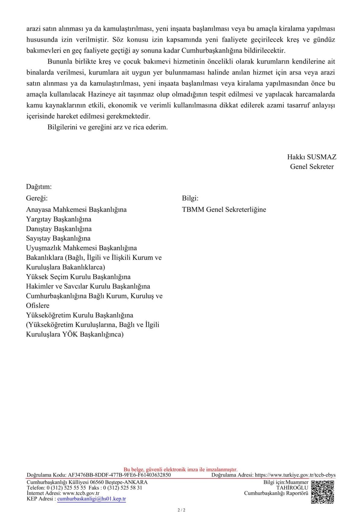 Cumhurbaşkanlığı tarafından kamu kurum ve kuruluşlarına gönderilen resmi yazıyla; kamu kurumlarında kreş ve gündüz bakımevlerinin yaygınlaştırılması ve kapasitelerinin artırılması istenilmiştir.