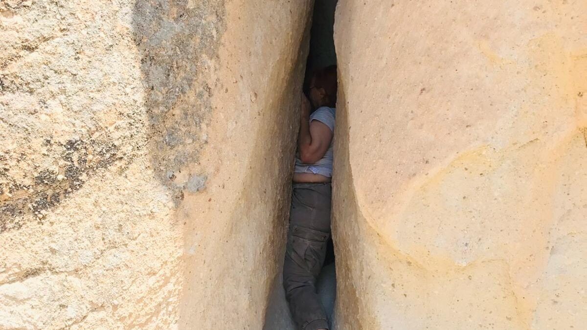 İhbarla gelen AFAD ekipleri, ABD'li kadını bulunduğu yerden kurtarmak için çalışma başlattı. Hilti ile yaklaşık yarım saat kırma çalışması yapan ekipler, turisti sıkıştığı yerden kurtardı.