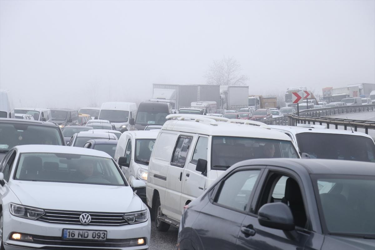 Bursa'da etkili olan kar yağışı nedeniyle kenti İstanbul'a bağlayan kara yolunda yoğunluk yaşandı.