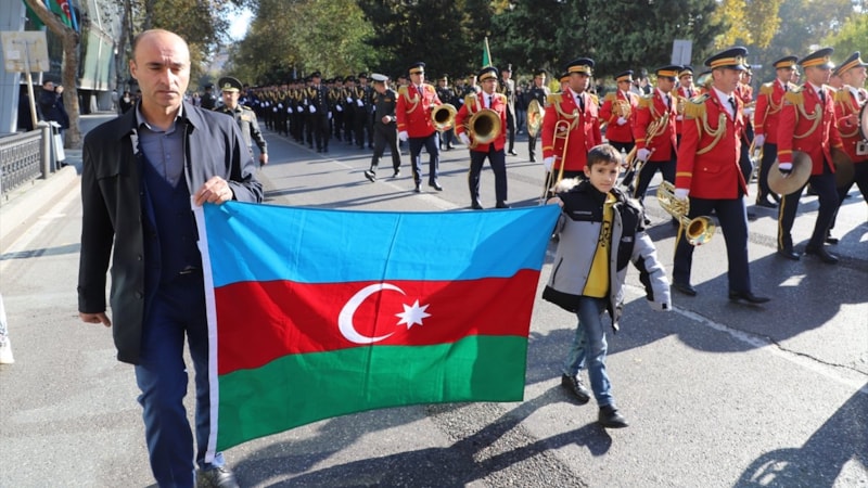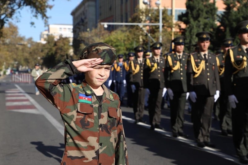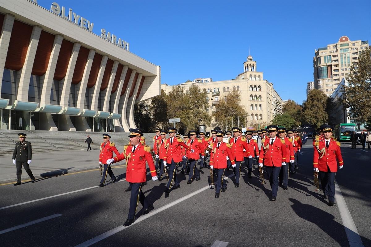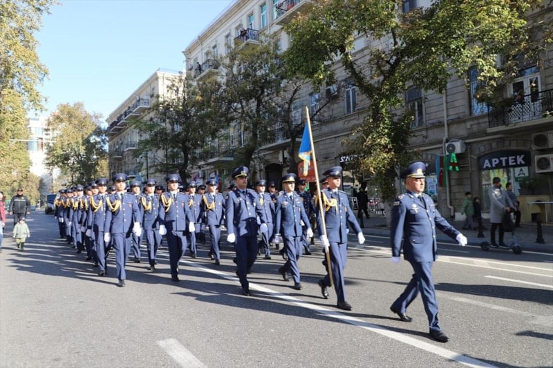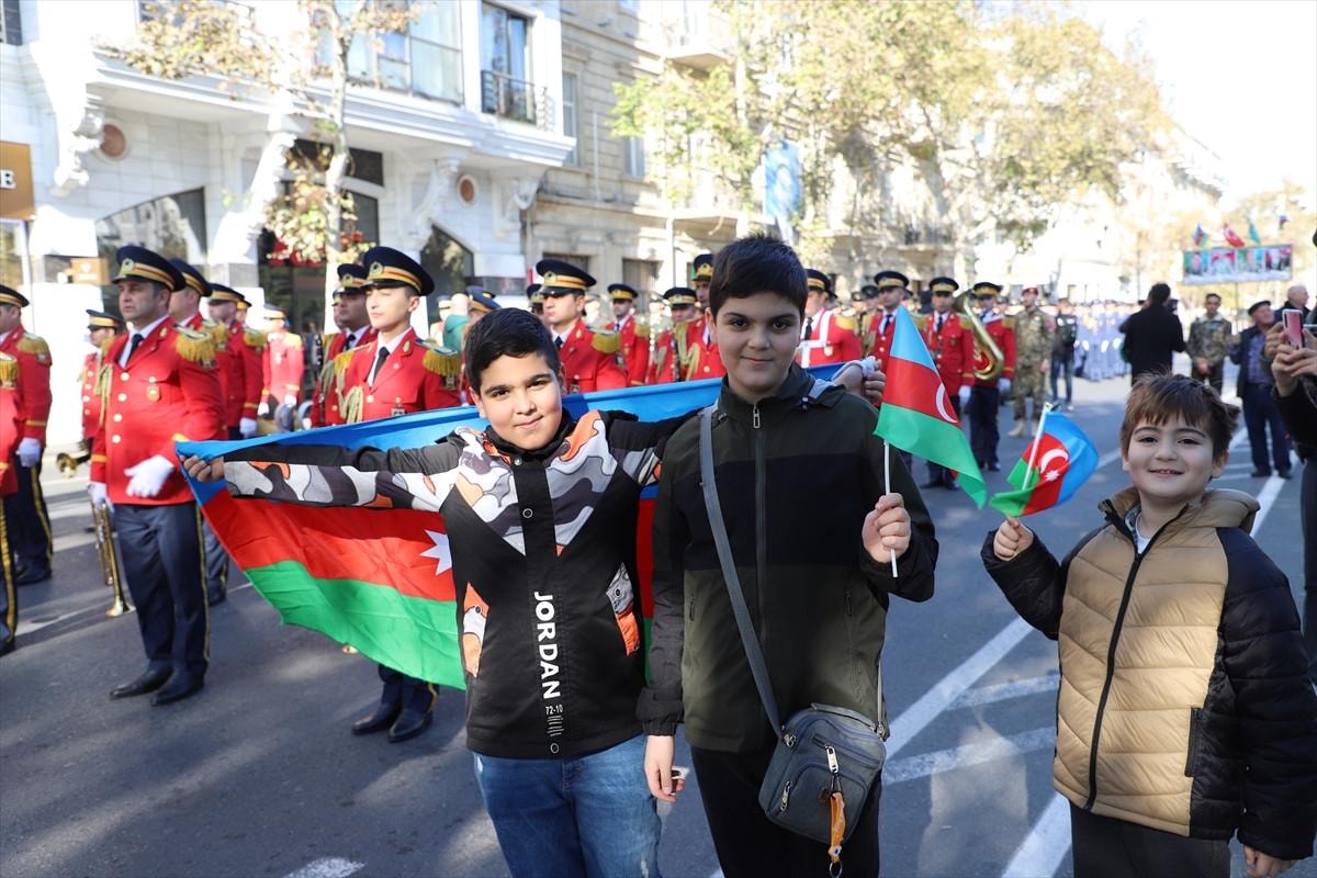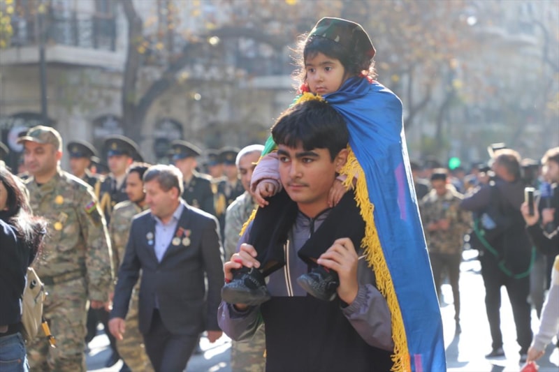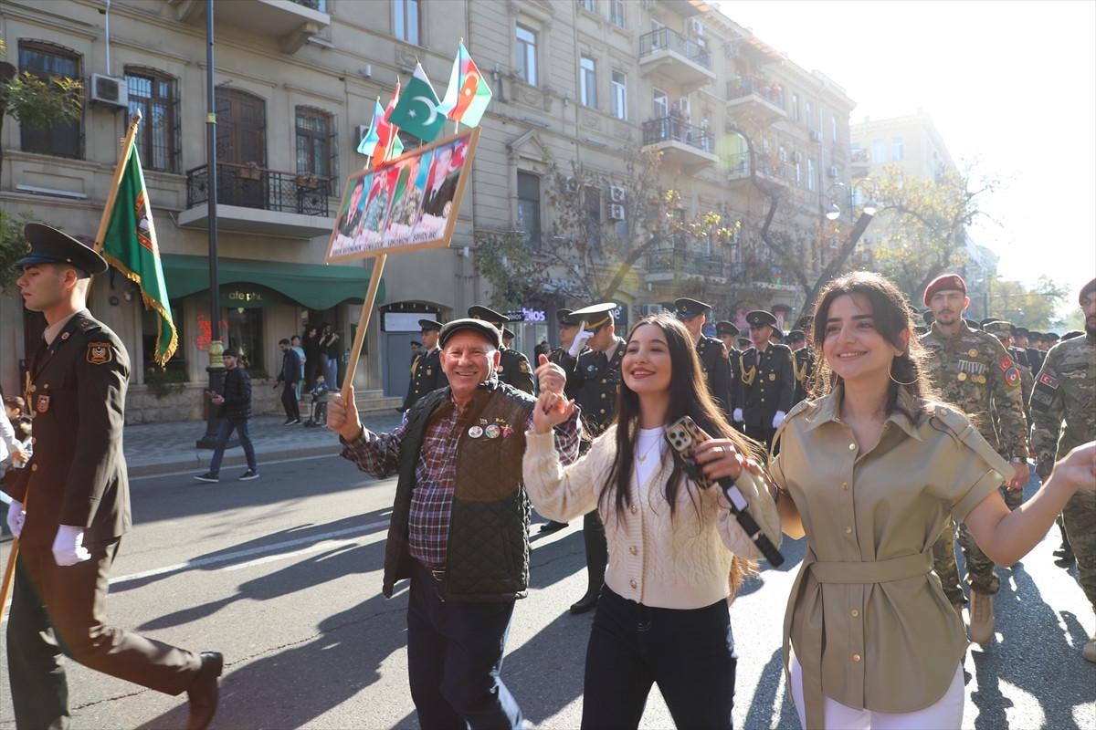 "Zafer Günü" kutlamaları kapsamında Bakü'nün çeşitli bölgelerinde düzenlenen yürüyüşlere, askerler ve Karabağ Savaşı gazileri katıldı.