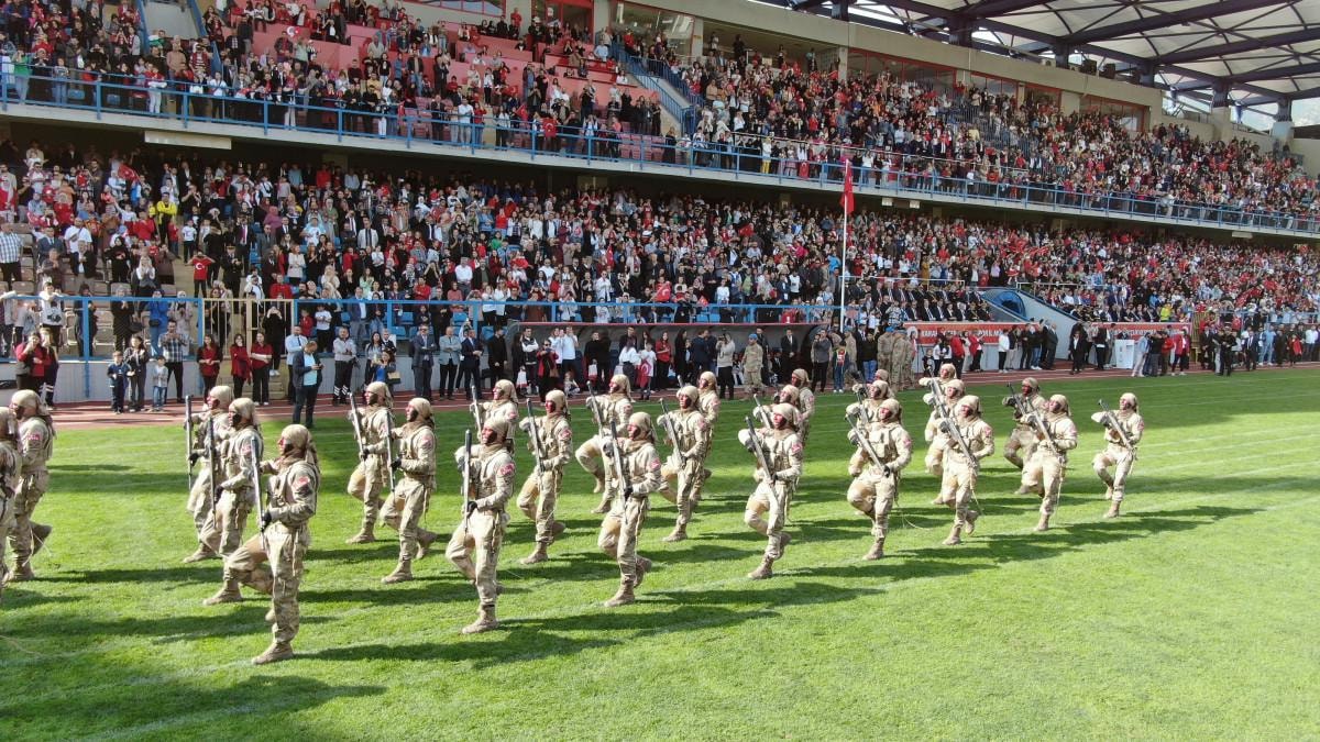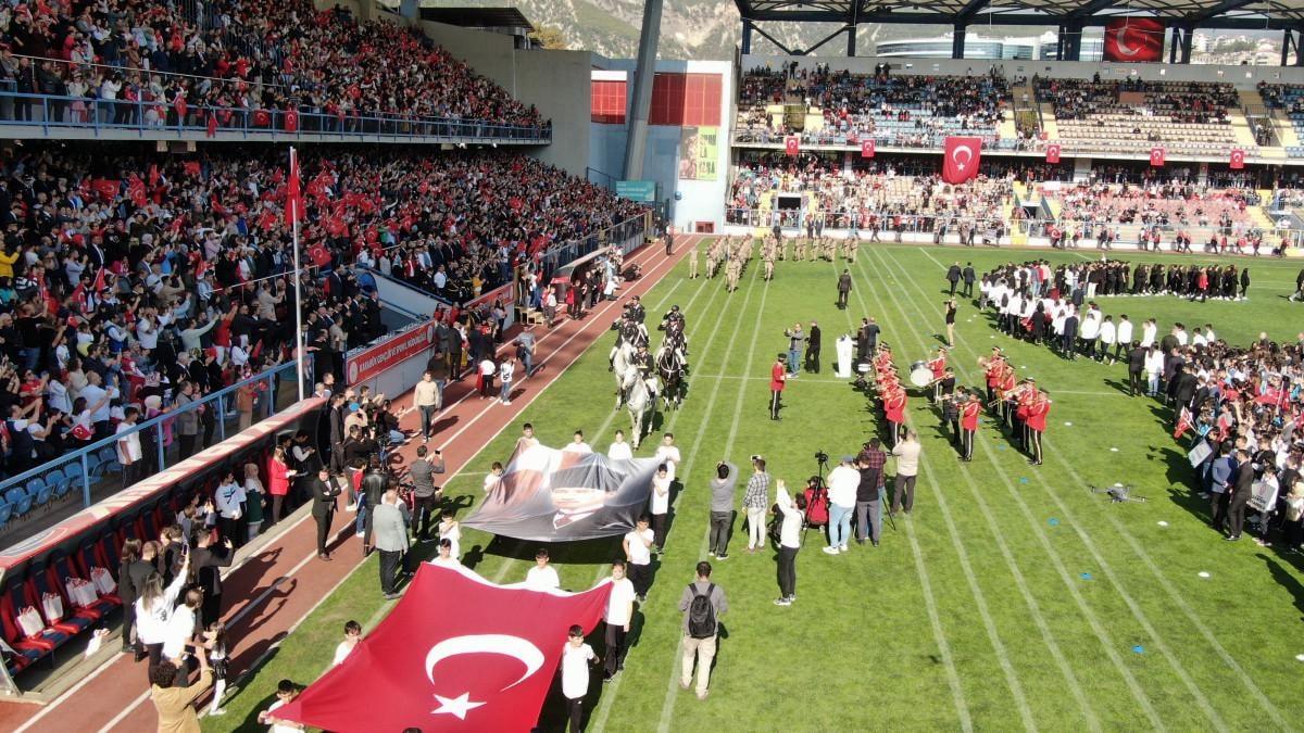 Saygı duruşu ve İstiklal Marşı’nın okunmasıyla başlayan programda Vali Yavuz ve Belediye Başkanı Rafet Vergili, stadı tıklım tıklım dolduran vatandaşların bayramını kutladı.