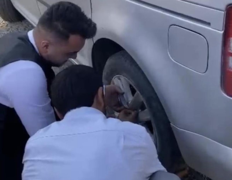 Kolları sıvayan damat lastiği yerine takarak bir de elleri ile bijonlarını sıktı.