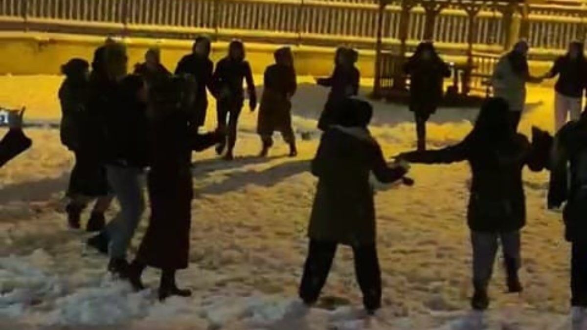 KYK kız öğrenci yurdunda kalan öğrenciler yurdun bahçesine çıkarak karın keyfini çıkardı. Öğrenciler bir süre sonra ise kar üzerinde müzik eşliğinde halay çekti.
