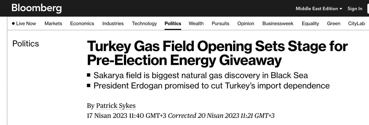 Sakarya sahasının Karadeniz'de keşfedilen en büyük doğalgaz kaynağı olduğunu vurgularken Bloomberg "Türkiye seçim öncesi enerji hediyesi için sahne kuruyor" başlığını kullandı.
