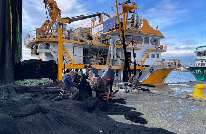 Ülkenin farklı kentlerinden Sinop'a gelen balıkçılar gece avcılık yaparken, gündüzleri limanda av sırasında yıpranan ağlarını onarıyor.