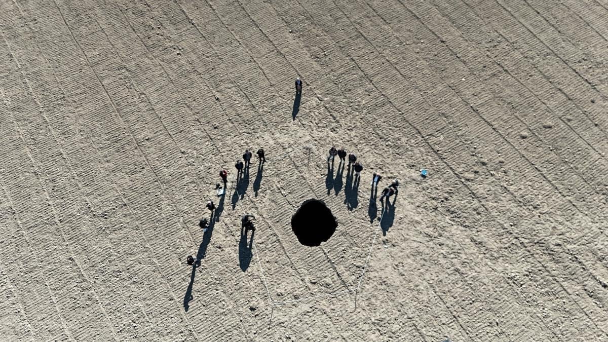 Çapı küçük gibi görünse de şu anda obruğun derinliğinin ne kadar olduğunu göremiyoruz, ancak 70-80 metre derinliğinde olduğunu tahmin ediyoruz. Obruğun oluştuğu tarla yerleşim yerlerine çok yakın. Onun için inşallah üzücü bir durumla karşılaşmayız.