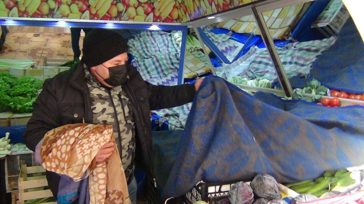 Kentte uzun yıllardan beri manavlık yapan Yücel Demirçiçek, sebzeleri donmasın diye battaniyeli önlem aldı.