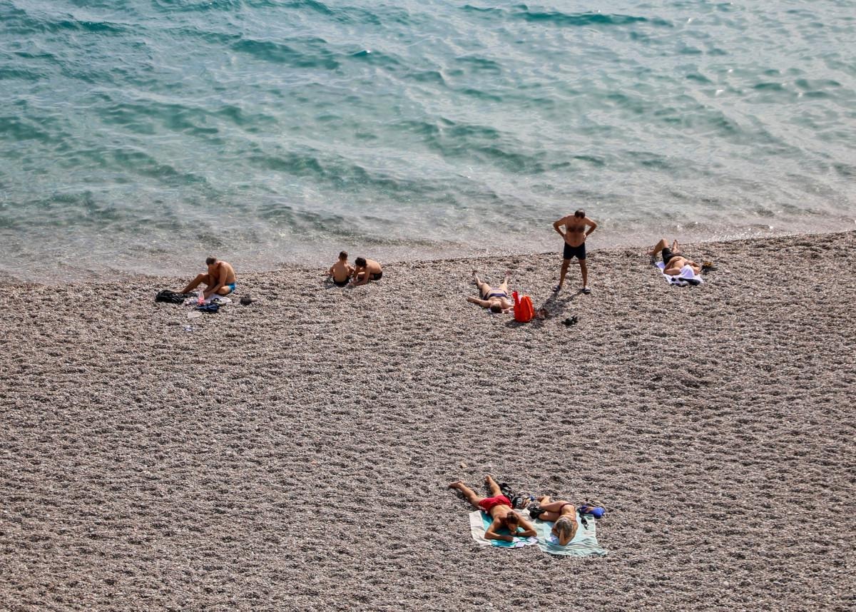 Sahile gelen bazı kişiler sıcaklığı 26 derece olan denizde yüzerken, kimileri ise kumsalda uzanarak güneşlenmeyi tercih etti.