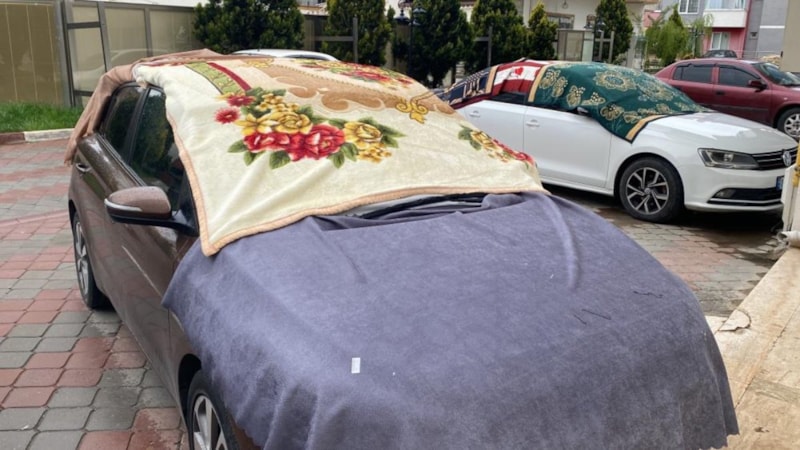 Sarı kodla uyarılan kentte, vatandaşlar dolu yağışı ihtimaline karşı araçlarının üzerine battaniye, yorgan ve halılarla örterek önlem aldı.