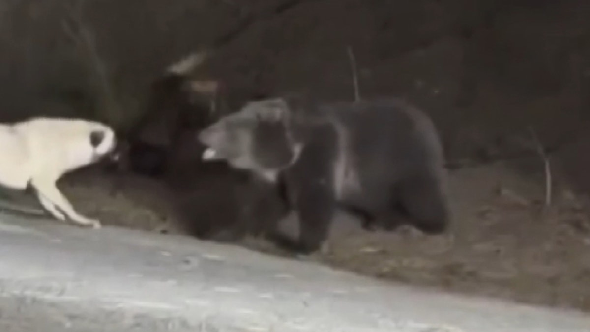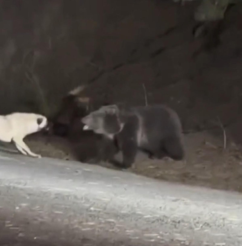 Görüntülerde, köpeklerin ayıya saldırmaya çalıştığı gözüküyor.