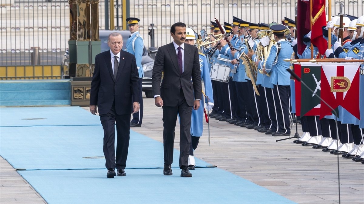 Erdoğan ve Al Sani'nin tören alanındaki yerlerini almasının ardından 21 pare top atışı eşliğinde milli marşlar çalındı.