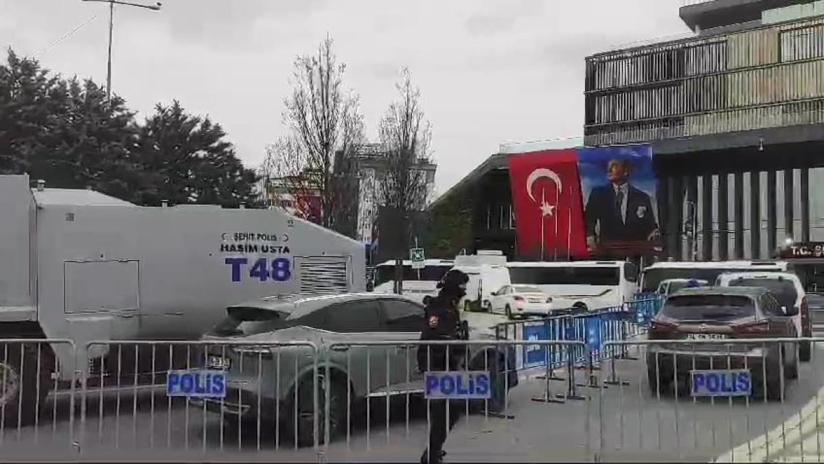Belediye önünde polis ekipleri geniş güvenlik önlemi alırken caddedeki bayrak ve posterler toplandı.