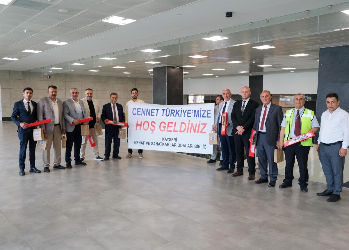 Kayseri'de KESOB Başkanı Şeyhi Odakır, TESKOMB Genel Başkan Vekili Mustafa Alan, KESOB Yönetim ve Denetim Kurulu üyeleri, Kayseri Erkilet Havalimanı’nda gurbetçi vatandaşları çiçeklerle karşıladı.