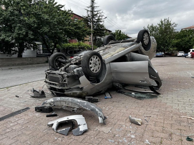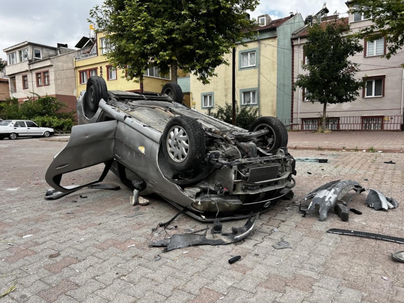 Ters çevrilen bir otomobil yolun ortasında yer aldı.