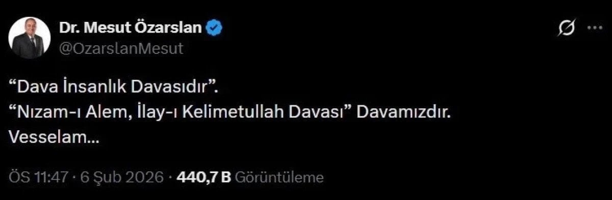 Özarslan paylaşımında "Dava İnsanlık Davasıdır. 'Nizam-ı Alem, İlay-ı Kelimetullah Davası' davamızdır. Vesselam…" ifadeleri yer almıştı.