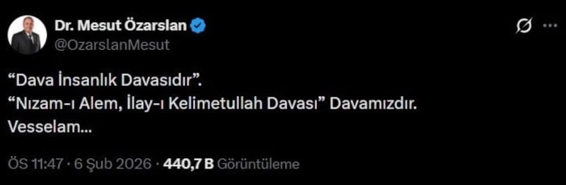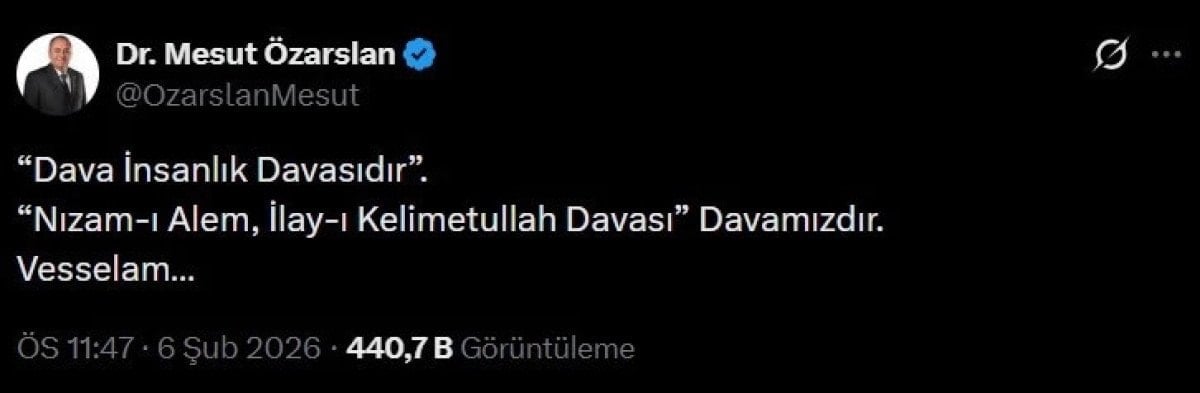 Özarslan paylaşımında "Dava İnsanlık Davasıdır. 'Nizam-ı Alem, İlay-ı Kelimetullah Davası' davamızdır. Vesselam…" ifadeleri yer aldı.