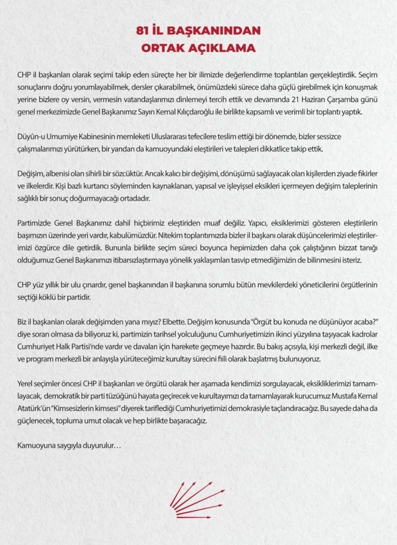 "CHP il başkanları olarak seçimi takip eden süreçte her bir ilimizde değerlendirme toplantıları gerçekleştirdik. Seçim sonuçlarını doğru yorumlayabilmek, dersler çıkarabilmek, önümüzdeki sürece daha güçlü girebilmek için konuşmak yerine bizlere oy versin, vermesin vatandaşlarımızı dinlemeyi tercih ettik ve devamında 21 Haziran Çarşamba günü genel merkezimizde Genel Başkanımız Sayın Kemal Kılıçdaroğlu ile birlikte kapsamlı ve verimli bir toplantı yaptık.